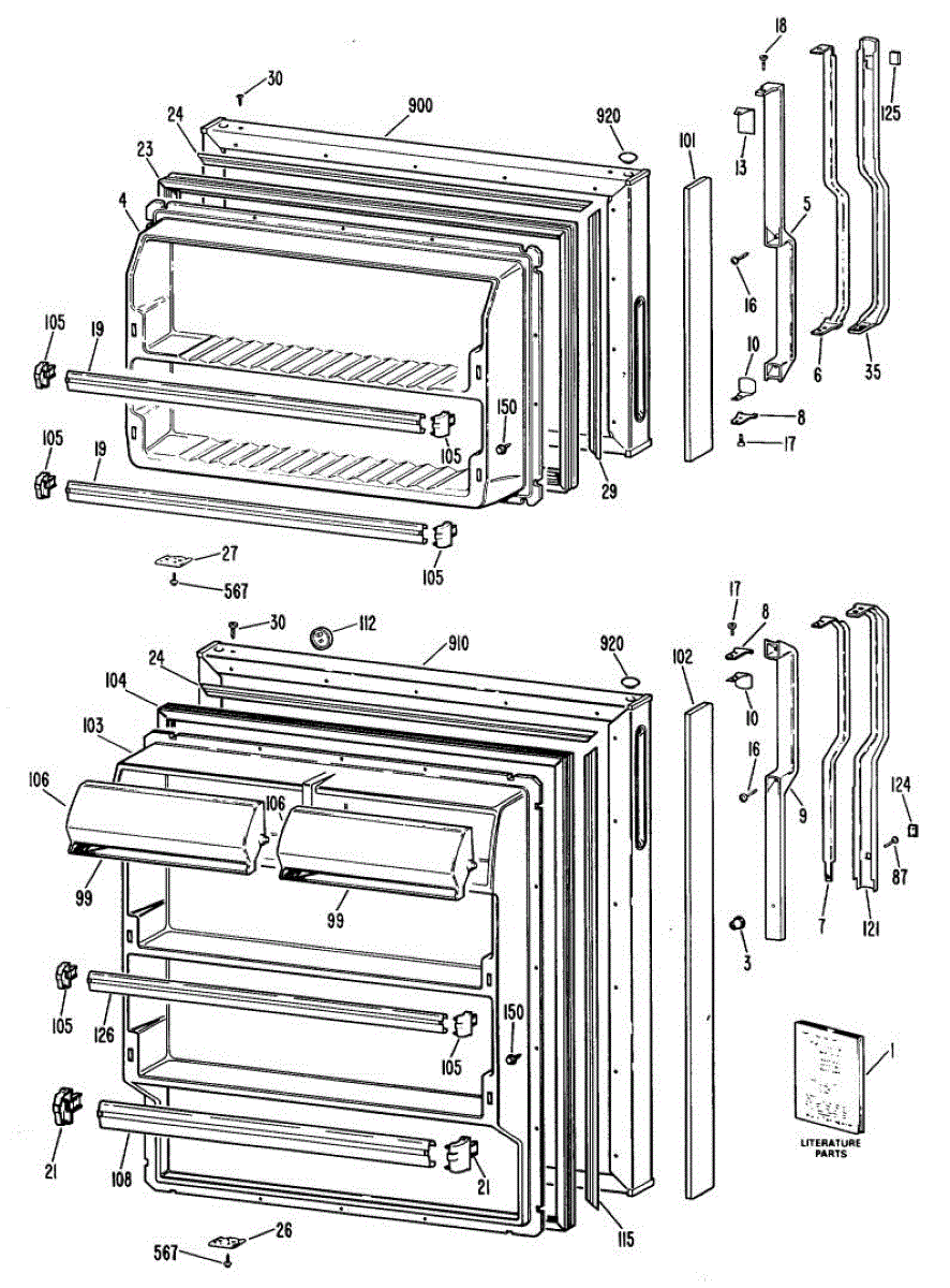 Hardware fasteners for securing refrigerator door panels and components. Includes screws, nuts, and washers for assembly. Replace missing or stripped pieces.