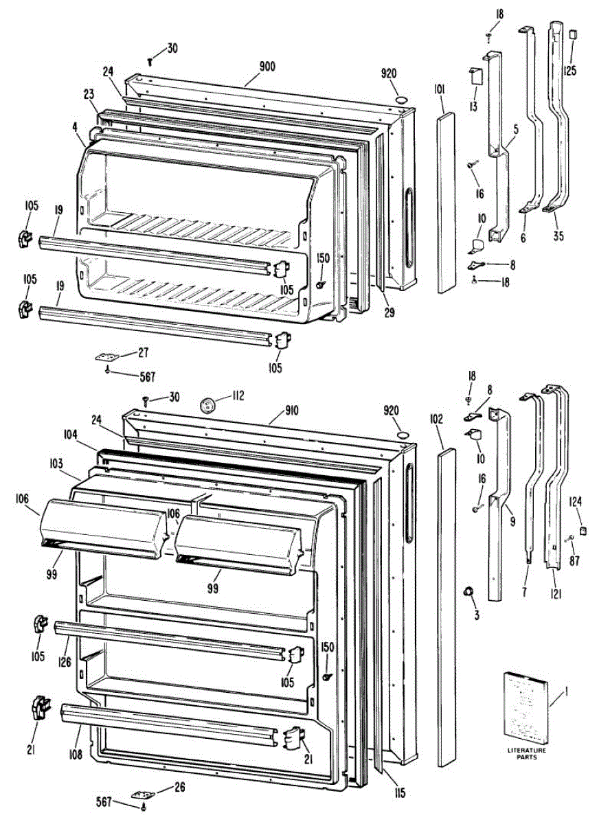 Hardware fasteners for securing refrigerator door panels and components. Includes screws, nuts, and washers for assembly. Replace missing or stripped pieces.