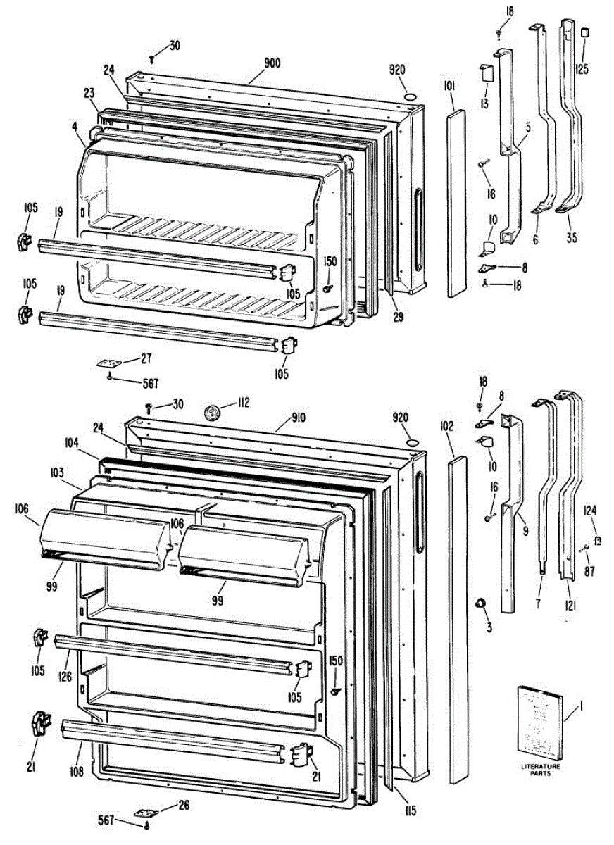 Hardware fasteners for securing refrigerator door panels and components. Includes screws, nuts, and washers for assembly. Replace missing or stripped pieces.