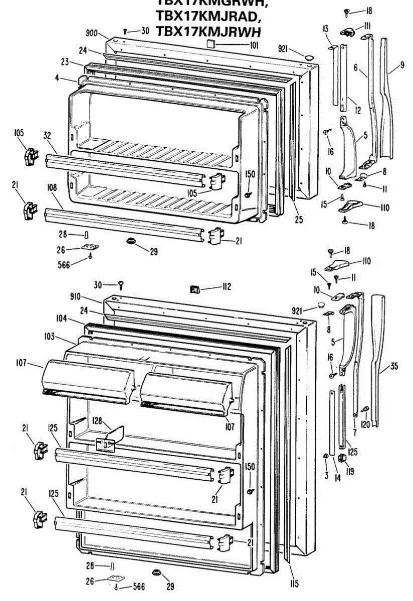 Hardware fasteners for securing refrigerator door panels and components. Includes screws, nuts, and washers for assembly. Replace missing or stripped pieces.