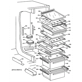 Cantilever shelf for side-by-side refrigerators. Replaces cracked, broken, or damaged shelving. Slides out for easy access to stored items.