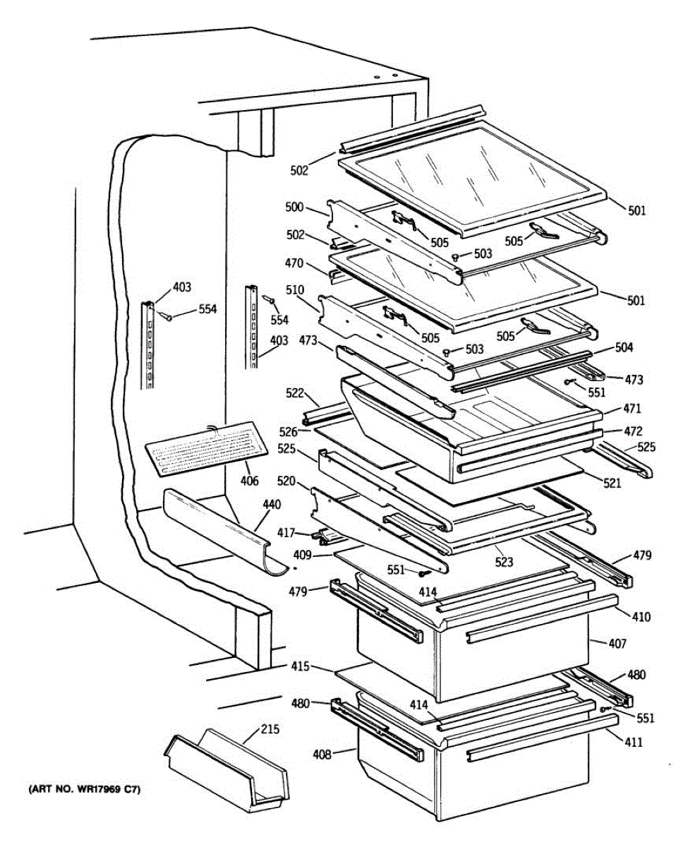Cantilever shelf for side-by-side refrigerators. Replaces cracked, broken, or damaged shelving. Slides out for easy access to stored items.