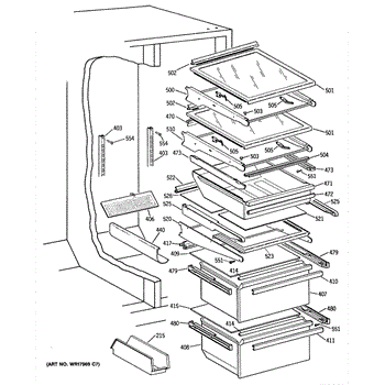 Cantilever shelf for side-by-side refrigerators. Replaces cracked, broken, or damaged shelving. Slides out for easy access to stored items.