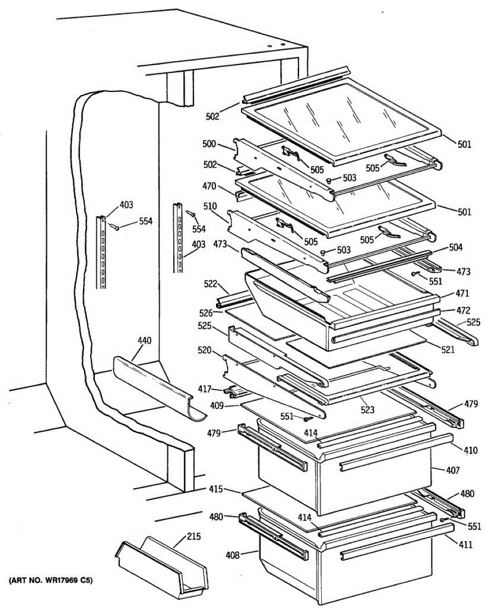 Cantilever shelf for side-by-side refrigerators. Replaces cracked, broken, or damaged shelving. Slides out for easy access to stored items.