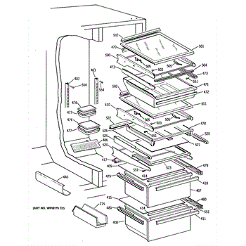 Cantilever shelf for side-by-side refrigerators. Replaces cracked, broken, or damaged shelving. Slides out for easy access to stored items.