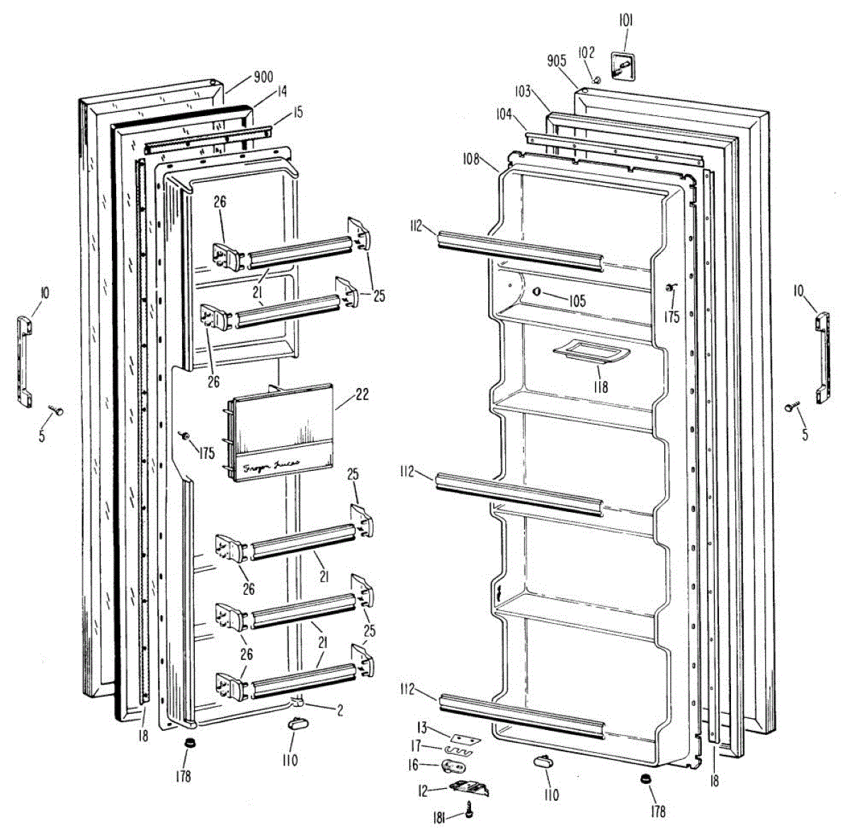Hardware fasteners for securing refrigerator door panels and components. Includes screws, nuts, and washers for assembly. Replace missing or stripped pieces.