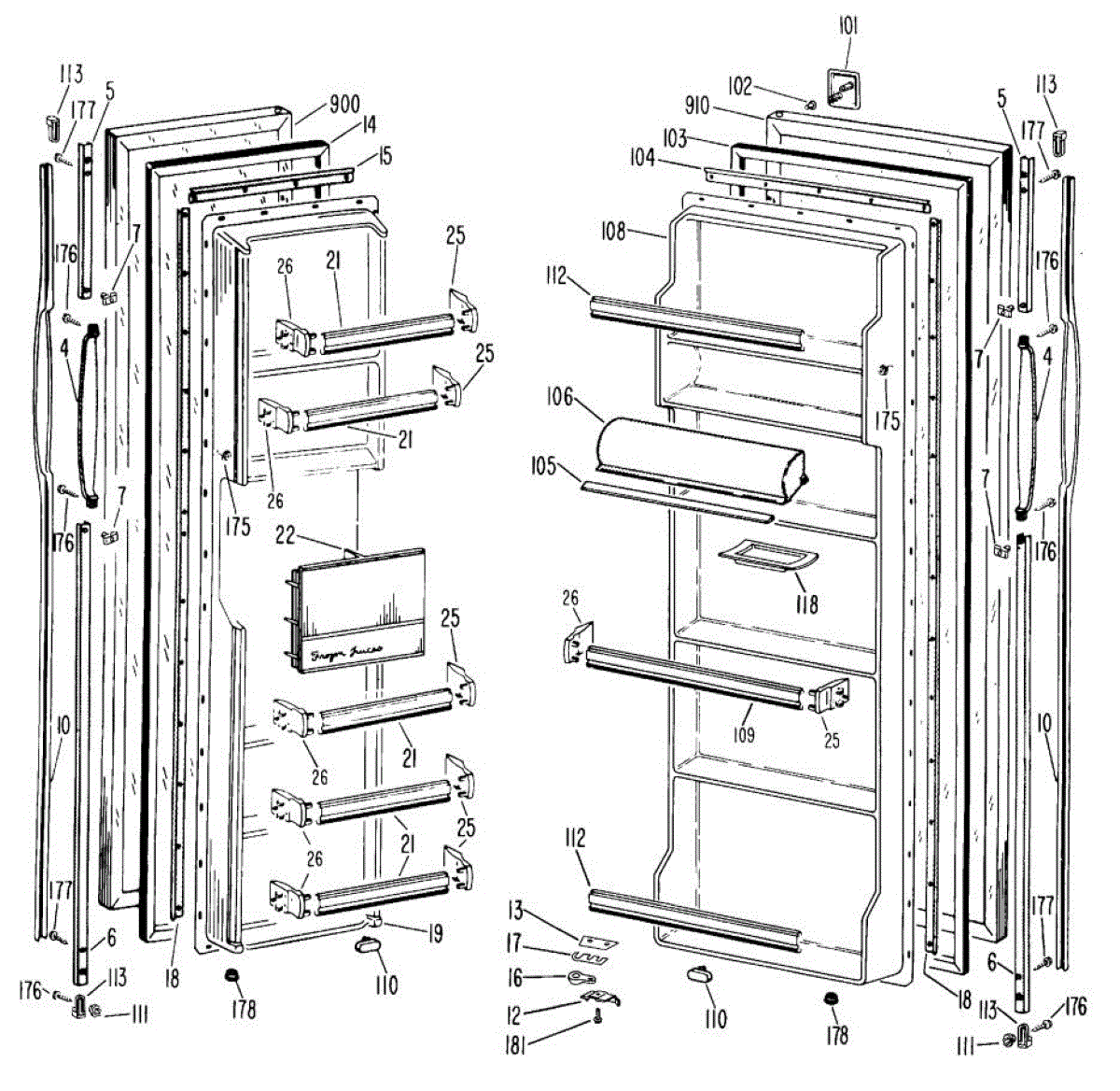 Hardware fasteners for securing refrigerator door panels and components. Includes screws, nuts, and washers for assembly. Replace missing or stripped pieces.
