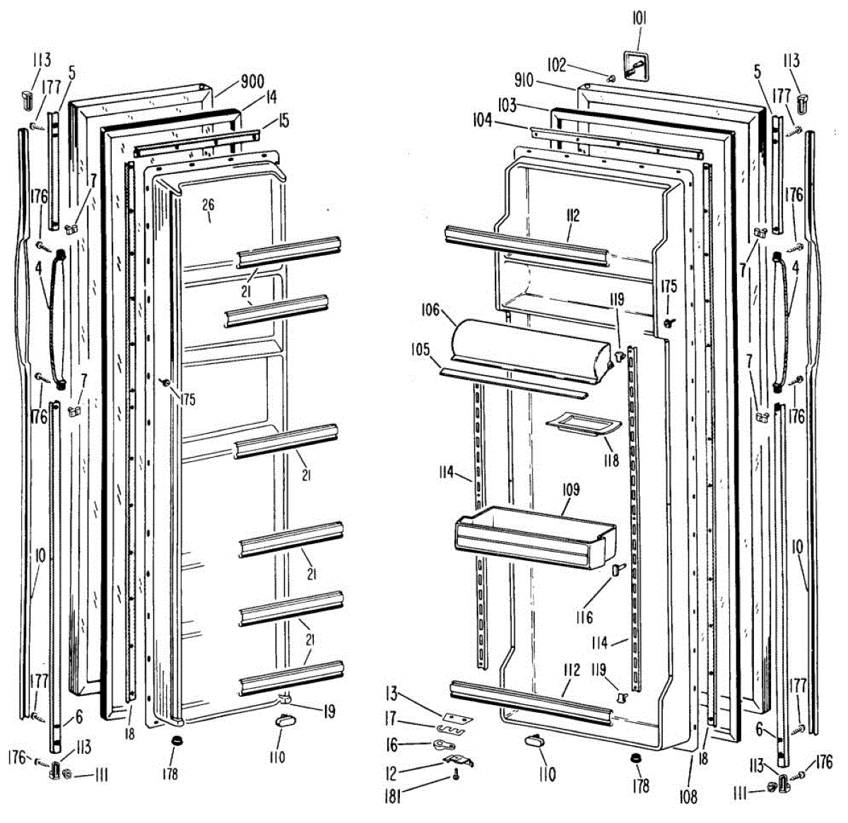 Hardware fasteners for securing refrigerator door panels and components. Includes screws, nuts, and washers for assembly. Replace missing or stripped pieces.
