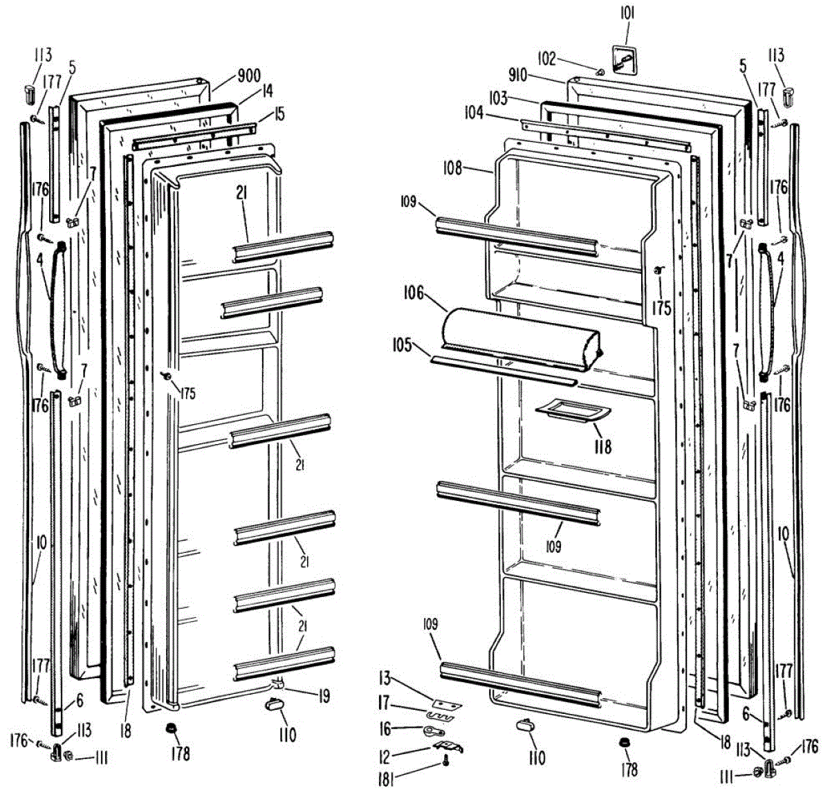 Hardware fasteners for securing refrigerator door panels and components. Includes screws, nuts, and washers for assembly. Replace missing or stripped pieces.