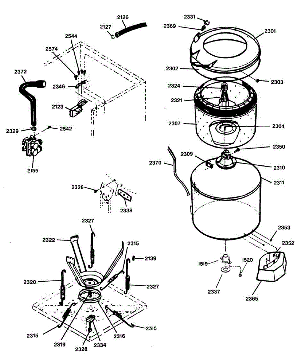 Suspension spring for washer tub support system. Replaces worn, broken, or missing springs that cause imbalance. Installs between tub and frame.