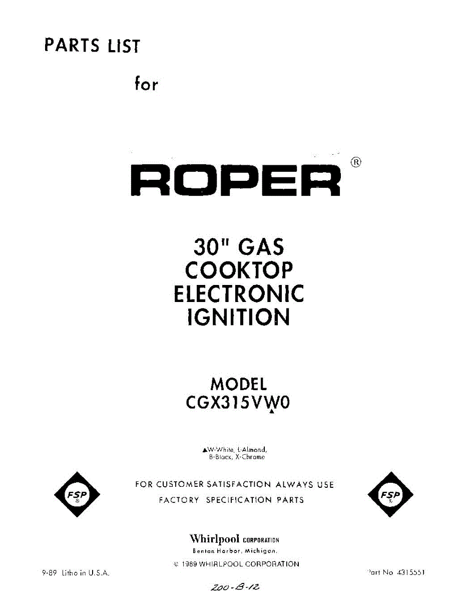 Parts for Roper CGX315VW0: 01 - Section Parts
