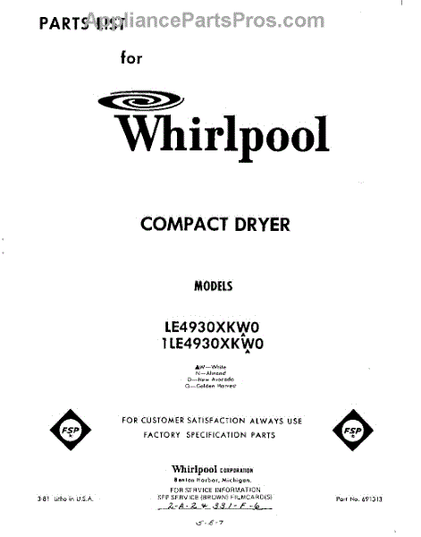 Parts for Whirlpool 1LE4930XKW0: 01 - Section Parts