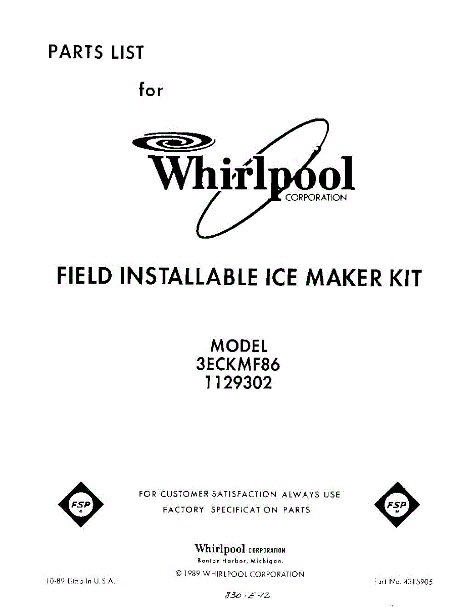 Parts for Whirlpool 3ECKMF86: 01 - Section Parts