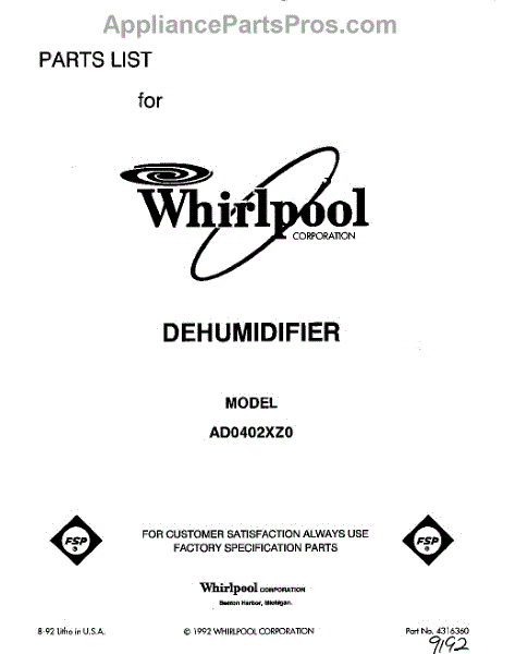 Parts for Whirlpool AD0402XZ0: 01 - Section Parts