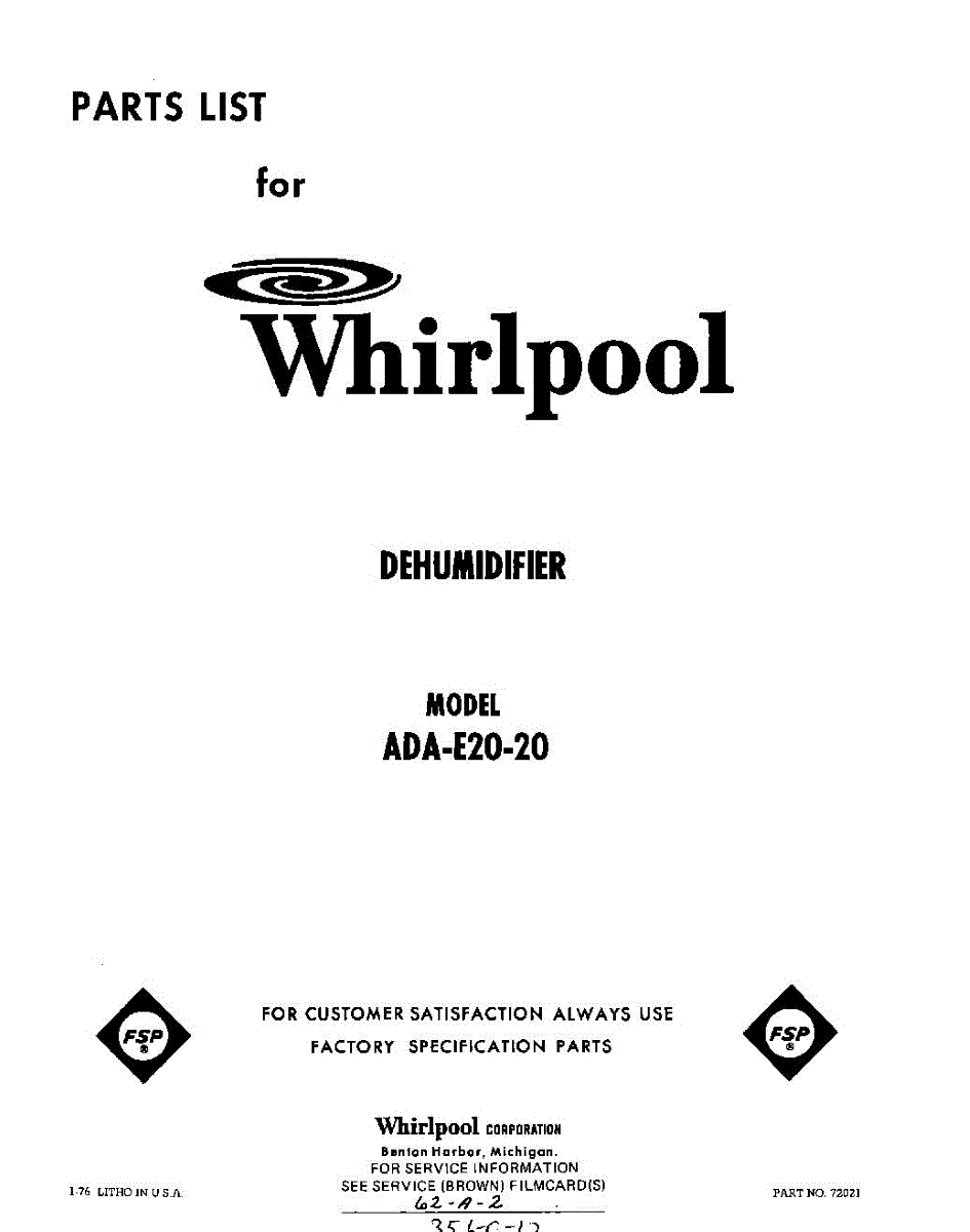 Parts for Whirlpool ADAE2020: 01 - Section Parts