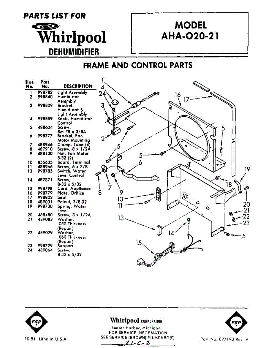 Parts for Whirlpool AHA02021: 01 - Section Parts