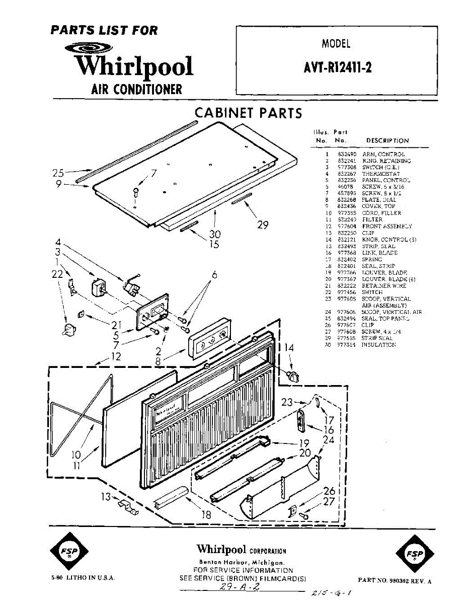 Parts for Whirlpool AVTR124112: 01 - Section Parts