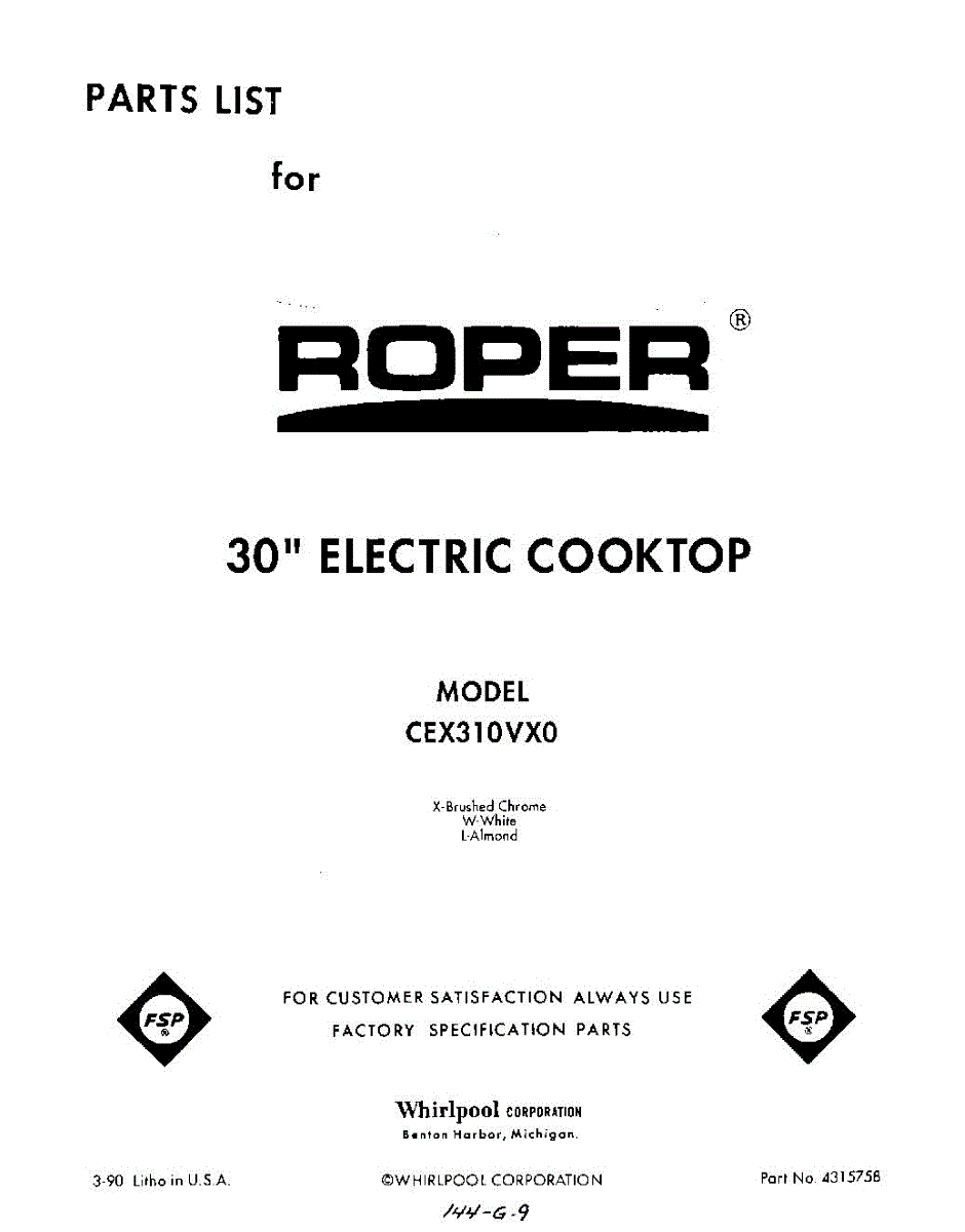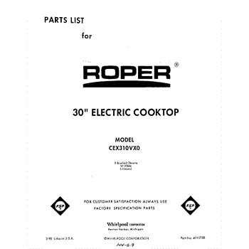 Parts for Whirlpool CEX310VW0: 01 - Section Parts