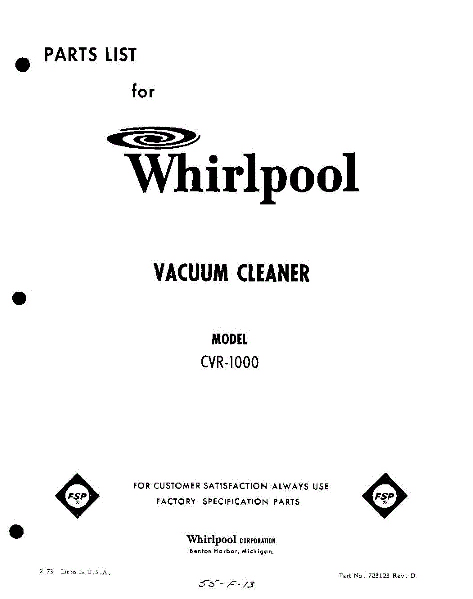 Parts for Whirlpool CVR1000: 01 - Section Parts