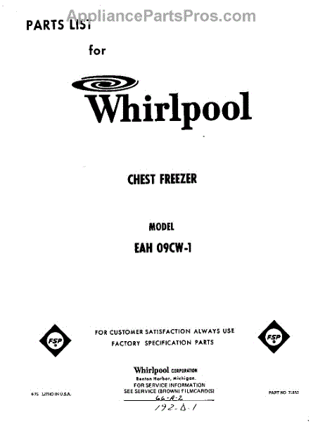 Parts for Whirlpool EAH09CW1: 01 - Section Parts