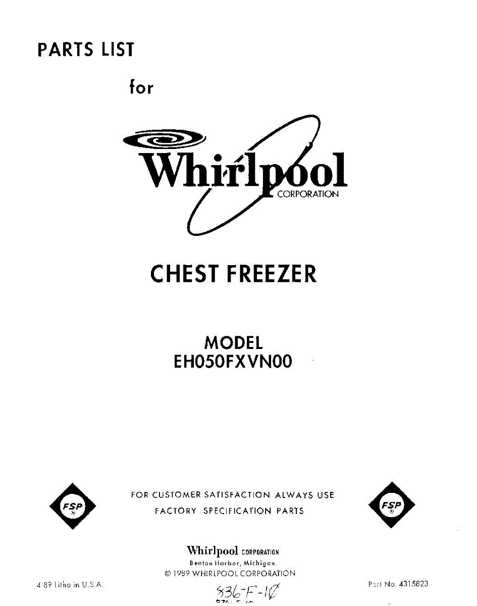 Parts for Whirlpool EH050FXVN00: 01 - Section Parts