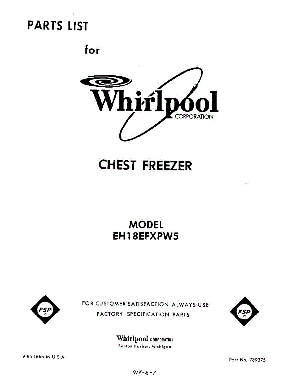 Parts for Whirlpool EH18EFXPW5: 01 - Section Parts