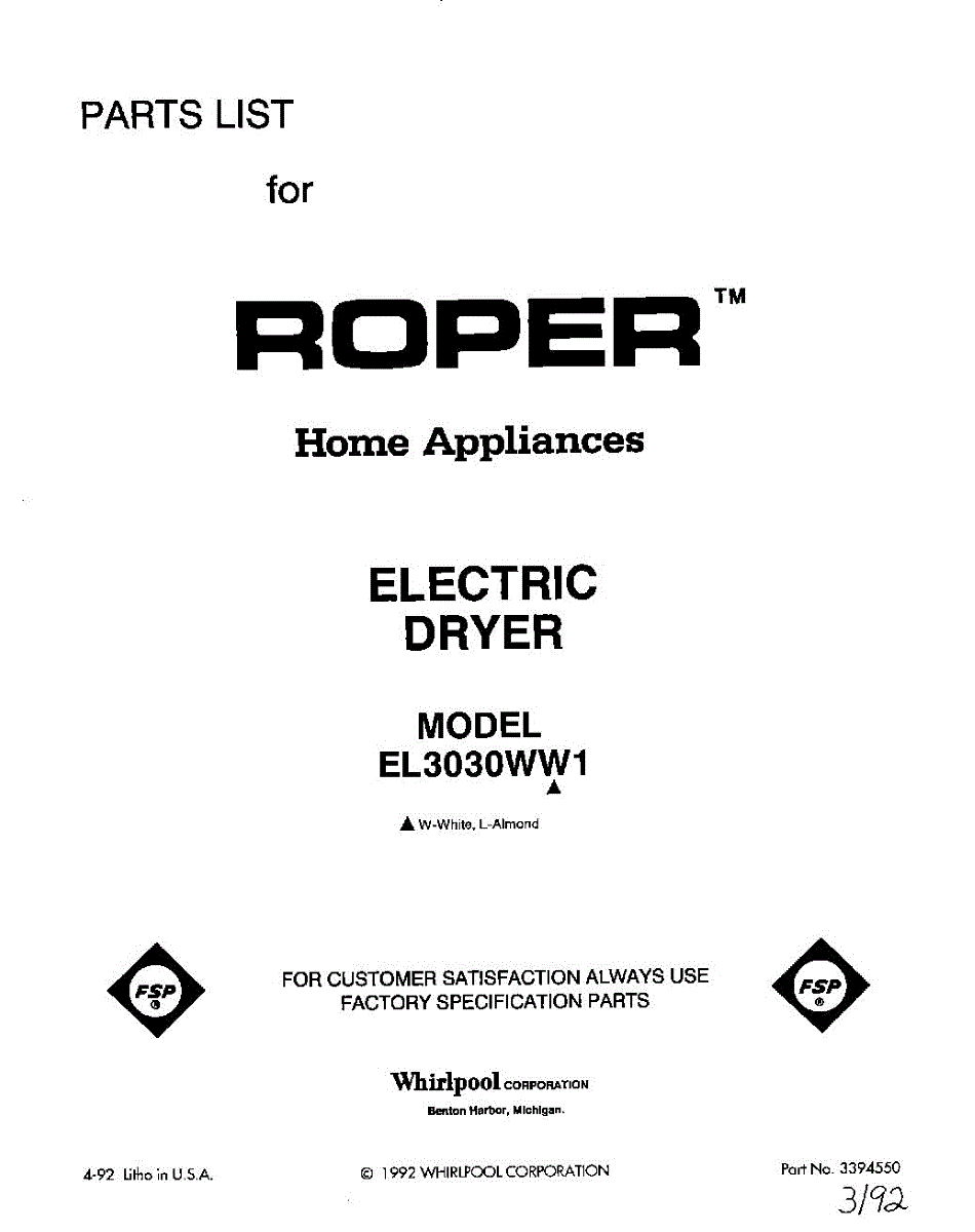 Parts for Whirlpool EL3030WL1: 01 - Section Parts