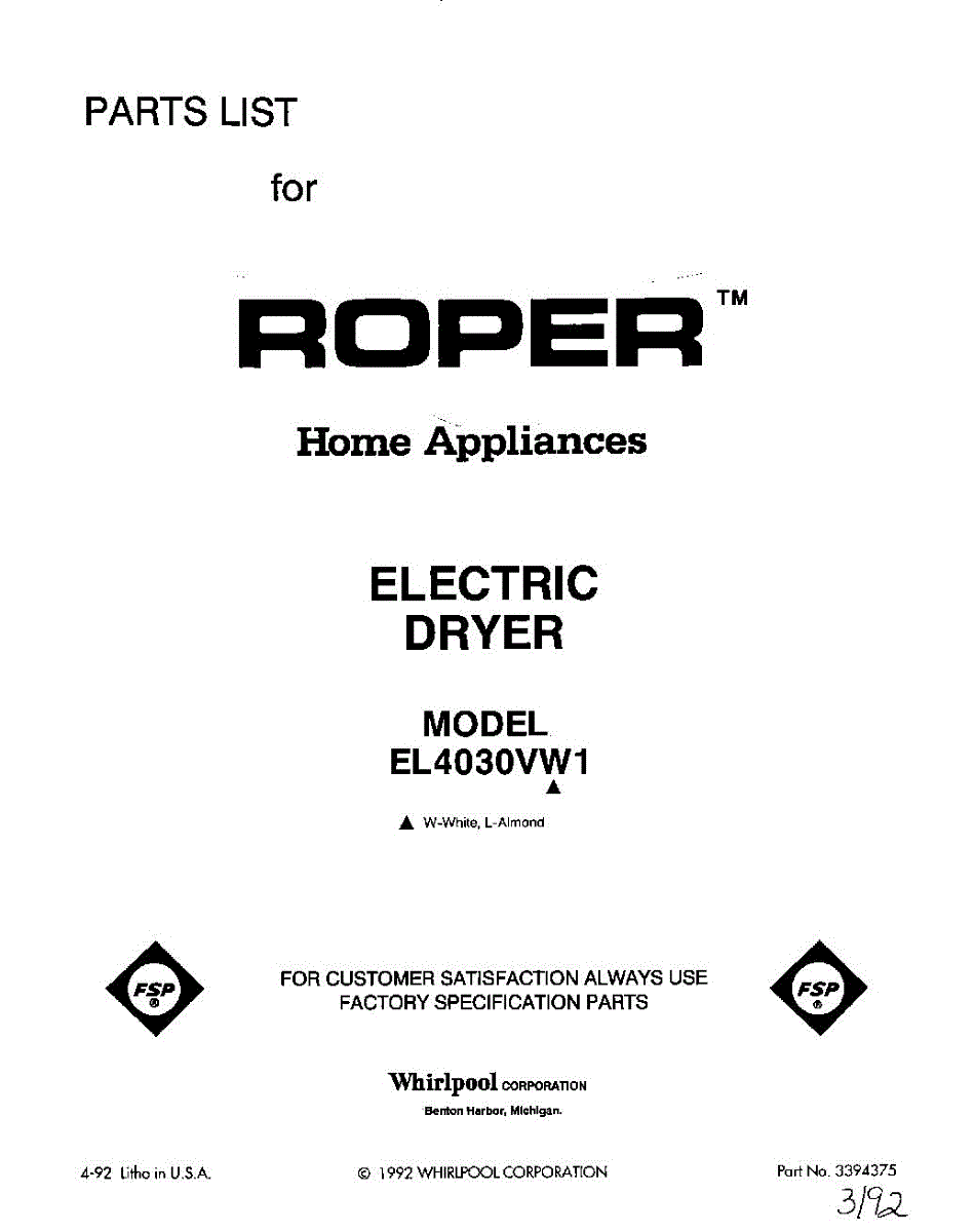 Parts for Whirlpool EL4030VL1: 01 - Section Parts
