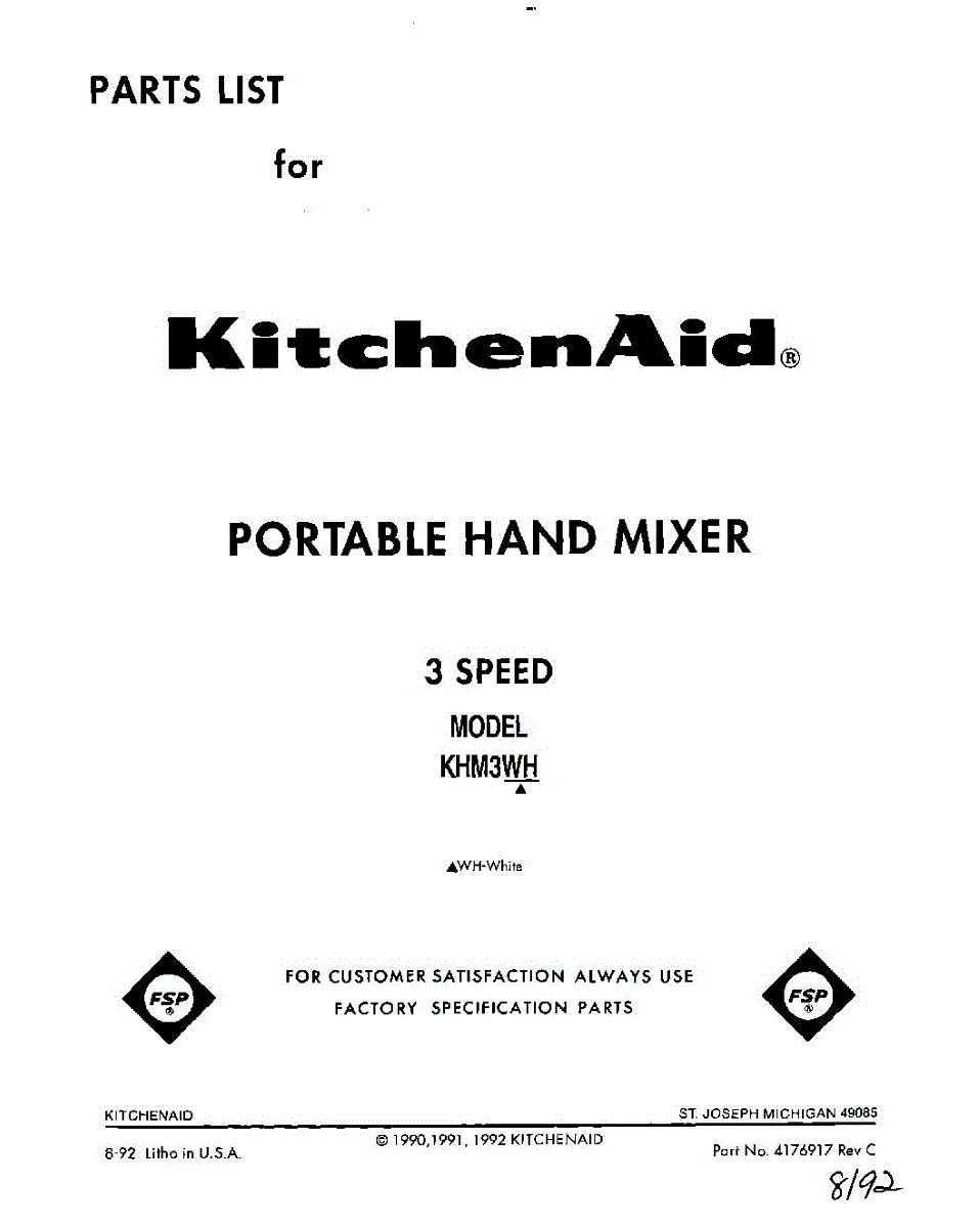 Parts for Kitchenaid KHM3WH: 01 - Section Parts