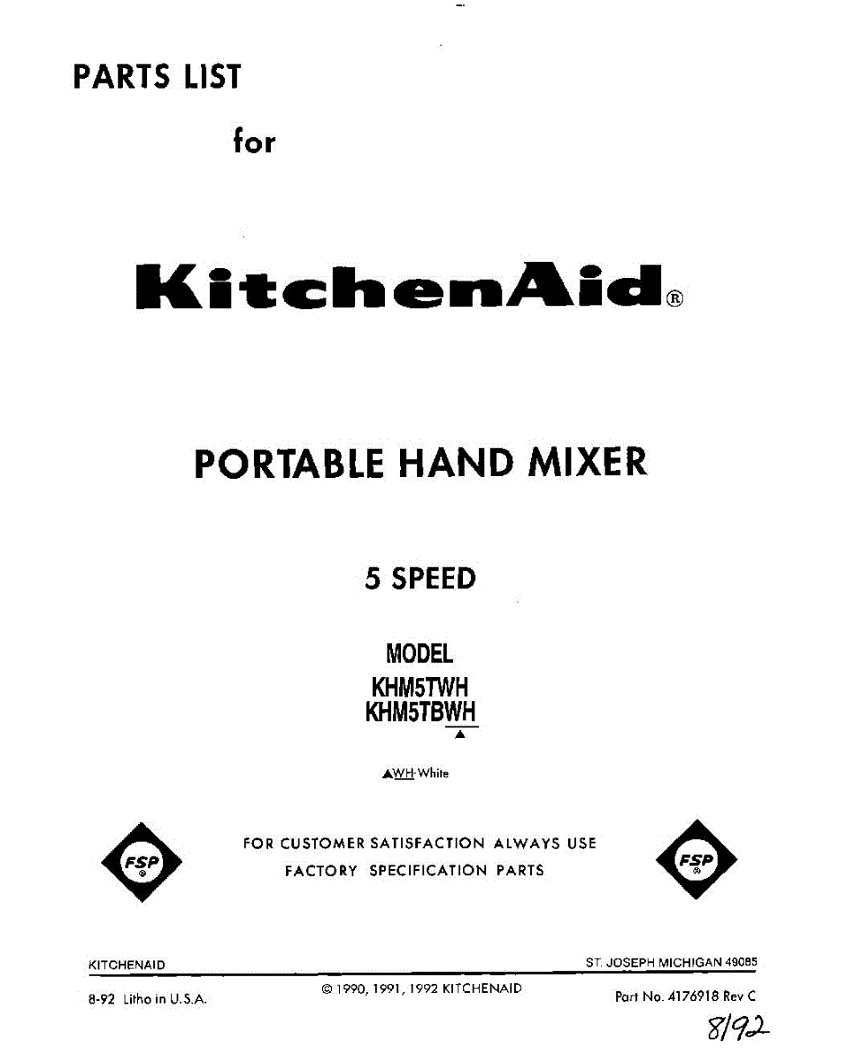 Parts for Kitchenaid KHM5TBWH: 01 - Section Parts