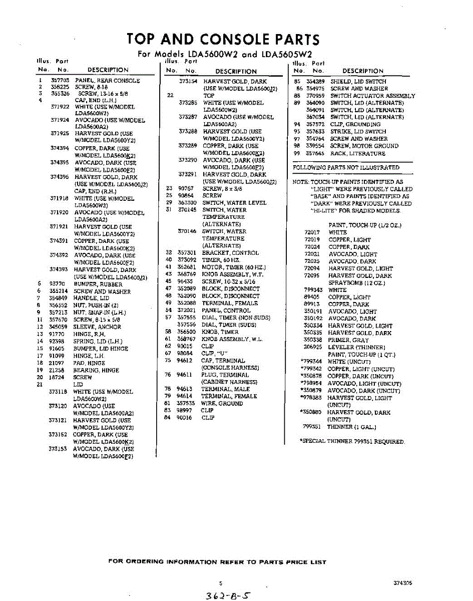 Parts for Whirlpool LDA5605W2: 05 - Section Parts