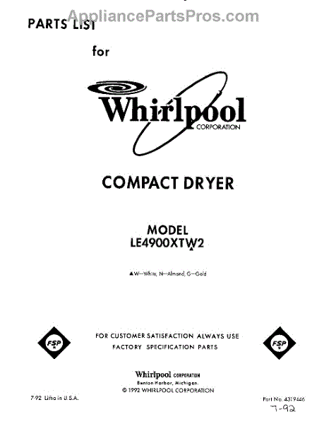 Parts for Whirlpool LE4900XTG2: 01 - Section Parts
