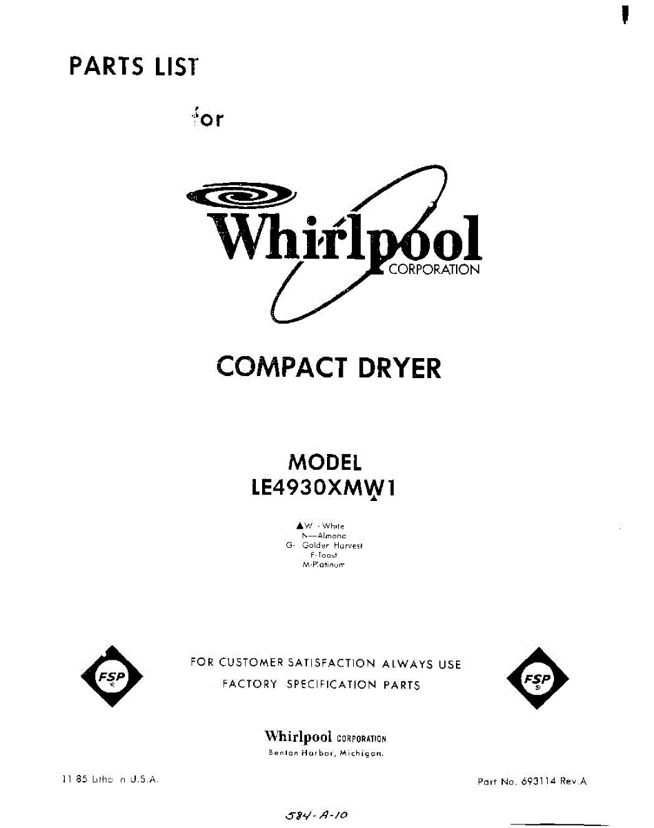 Parts for Whirlpool LE4930XMW1: 01 - Section Parts