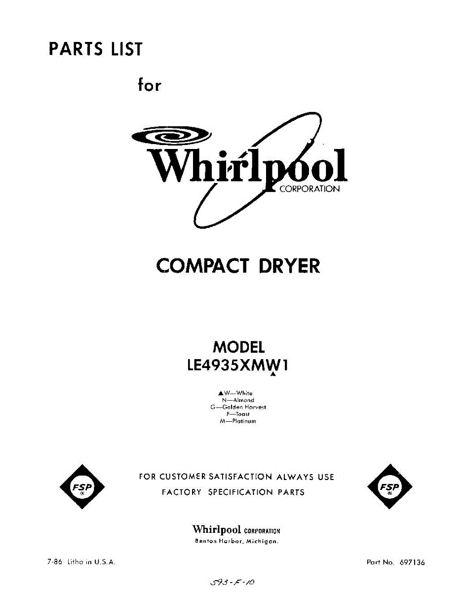 Parts for Whirlpool LE4935XMW1: 01 - Section Parts
