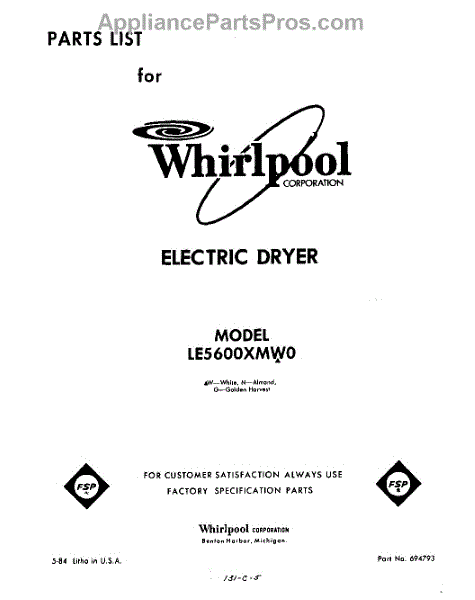 Parts for Whirlpool LE5600XMW0: 01 - Section Parts