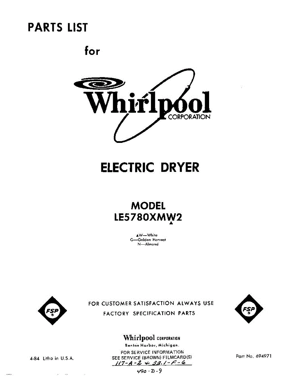 Parts for Whirlpool LE5780XMW2: 01 - Section Parts