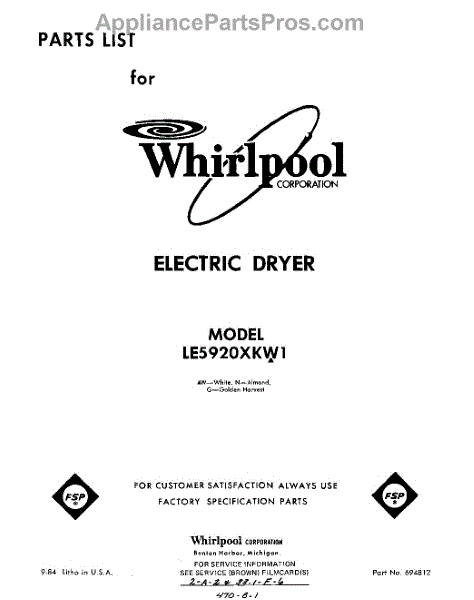 Parts for Whirlpool LE5920XKW1: 01 - Section Parts