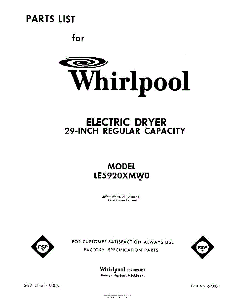 Parts for Whirlpool LE5920XMW0: 01 - Section Parts