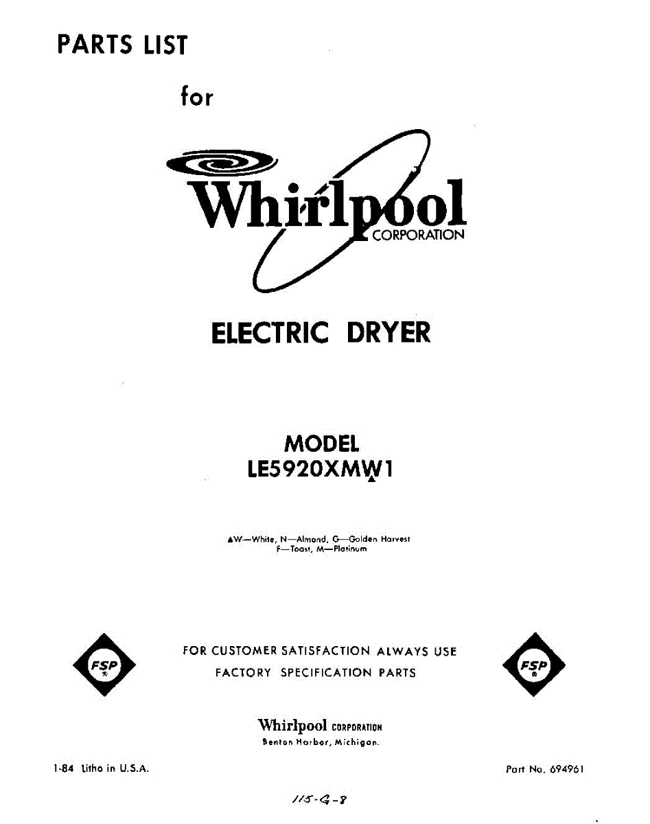 Parts for Whirlpool LE5920XMW1: 01 - Section Parts