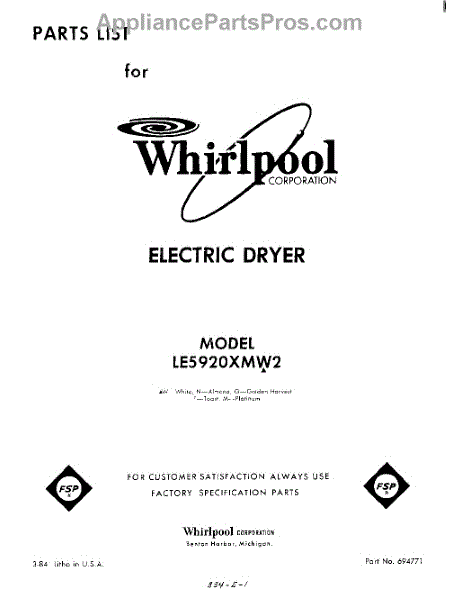 Parts for Whirlpool LE5920XMW2: 01 - Section Parts