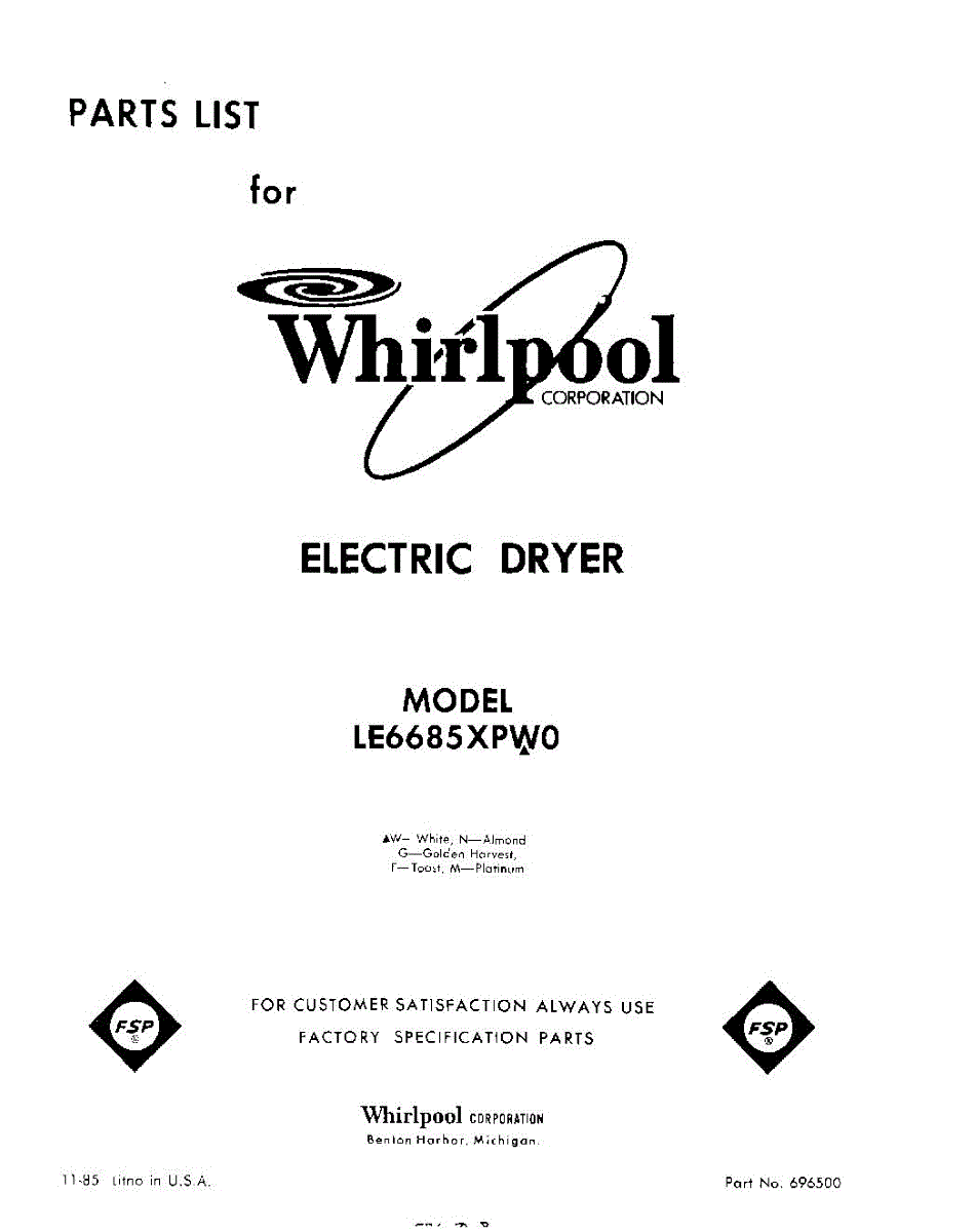 Parts for Whirlpool LE6685XPW0: 01 - Section Parts