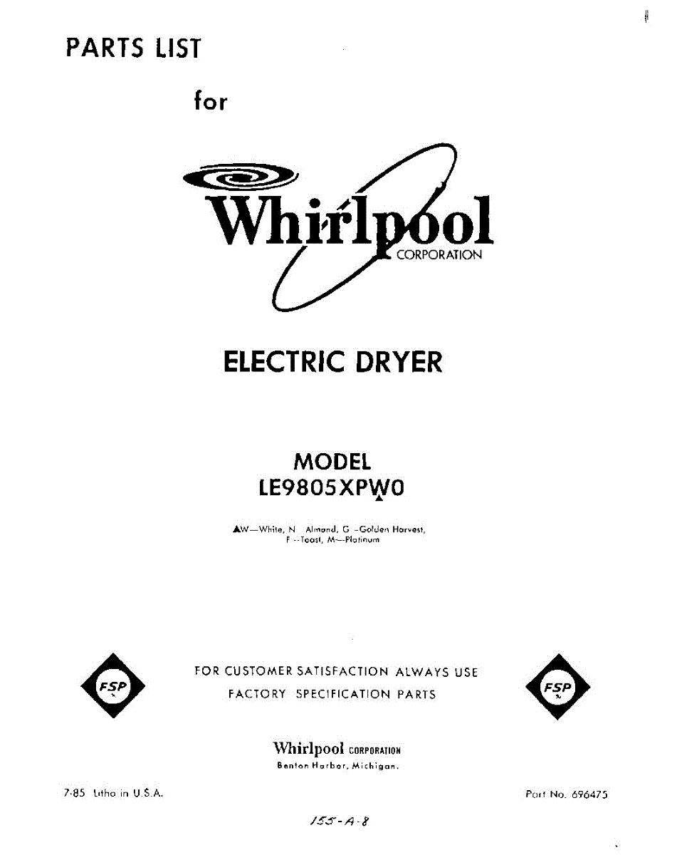 Parts for Whirlpool LE9805XPW0: 01 - Section Parts