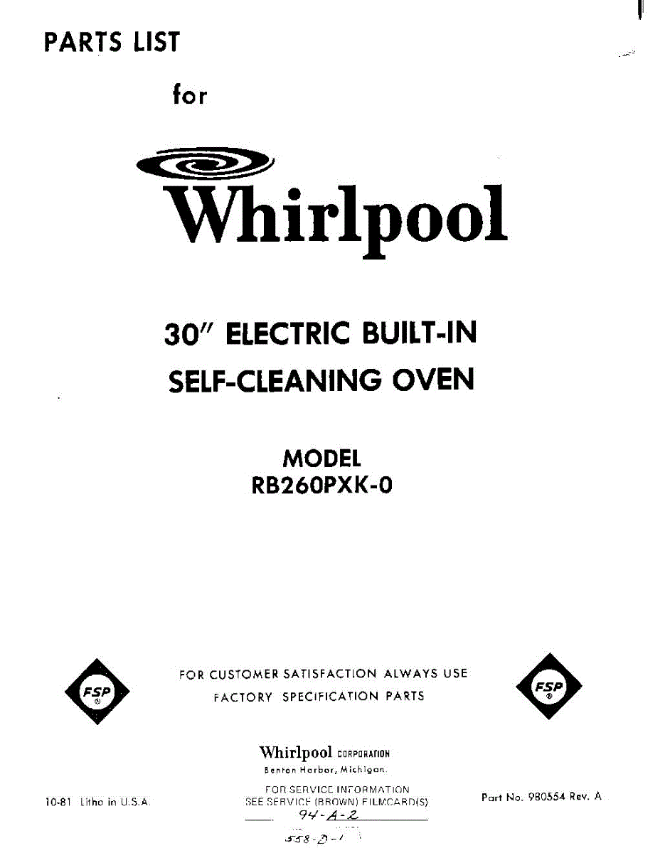 Parts for Whirlpool RB260PXK0: 01 - Section Parts