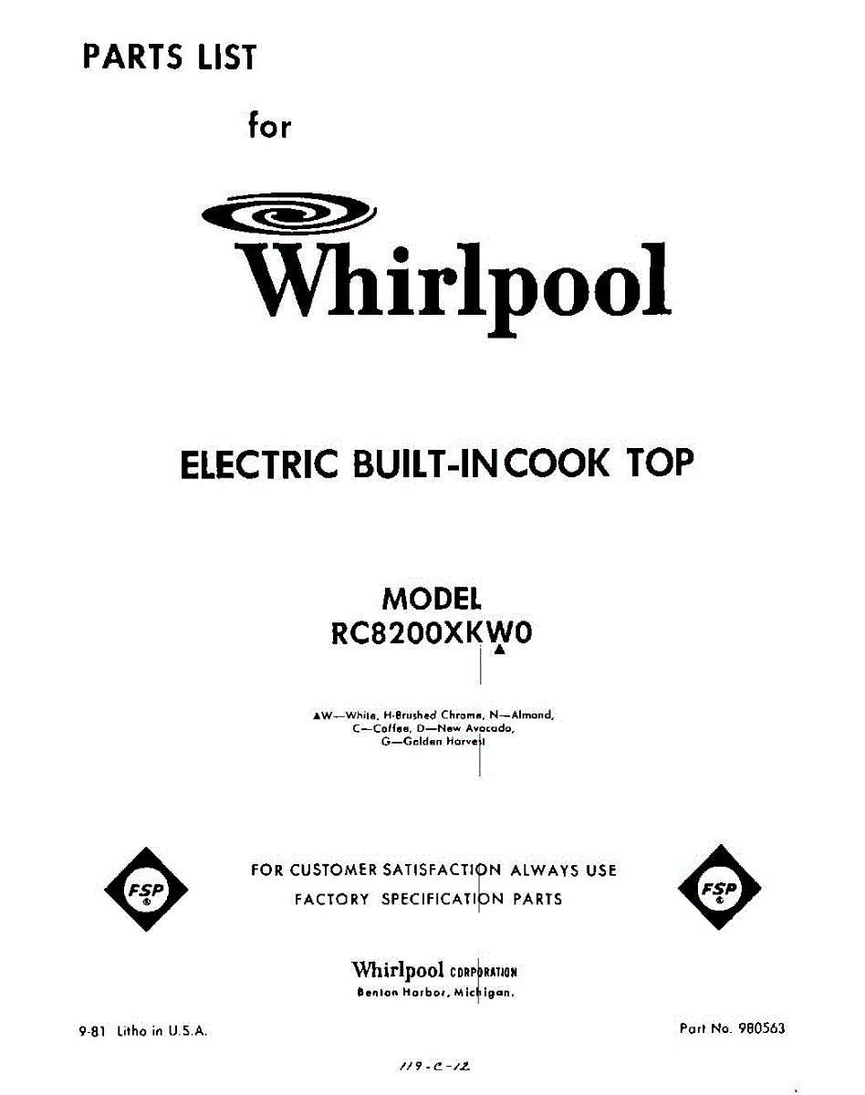 Parts for Whirlpool RC8200XKW0: 01 - Section Parts