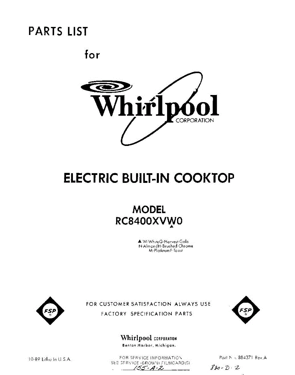 Parts for Whirlpool RC8400XVN0: 01 - Section Parts