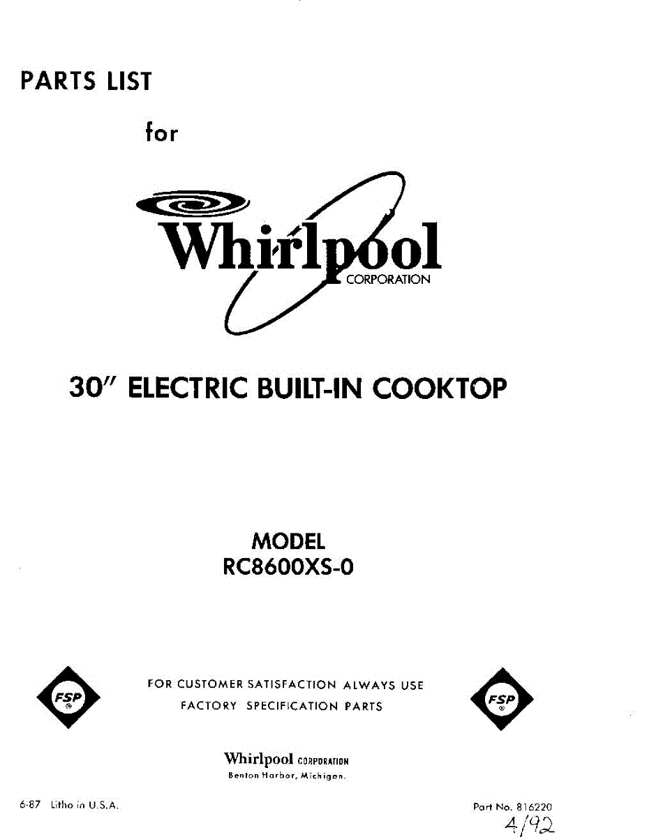 Whirlpool Cooktop Parts