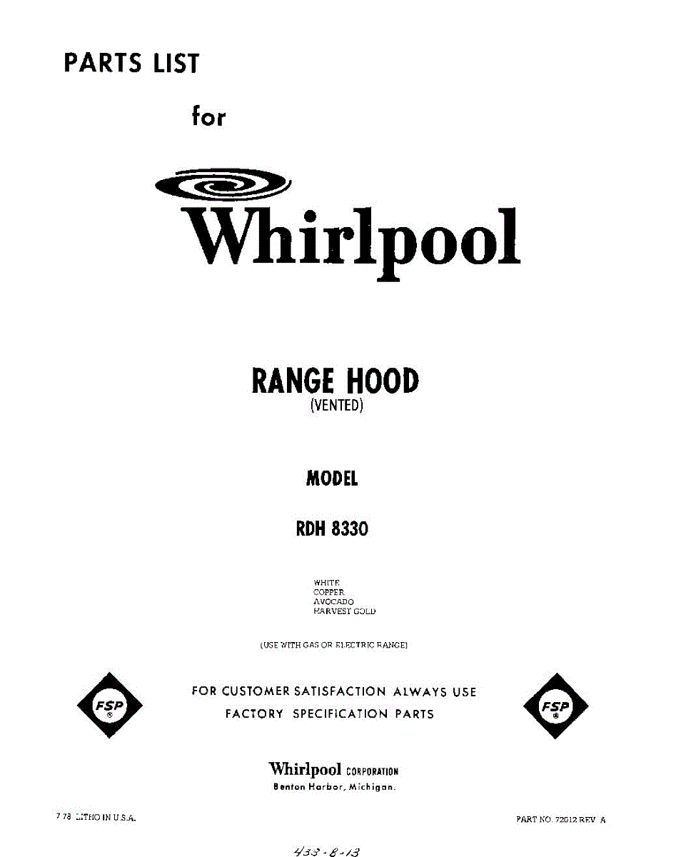 Parts for Whirlpool RDH8330: 01 - Section Parts
