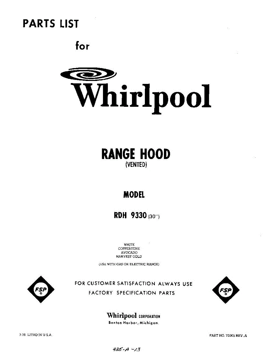 Parts for Whirlpool RDH9330: 01 - Section Parts