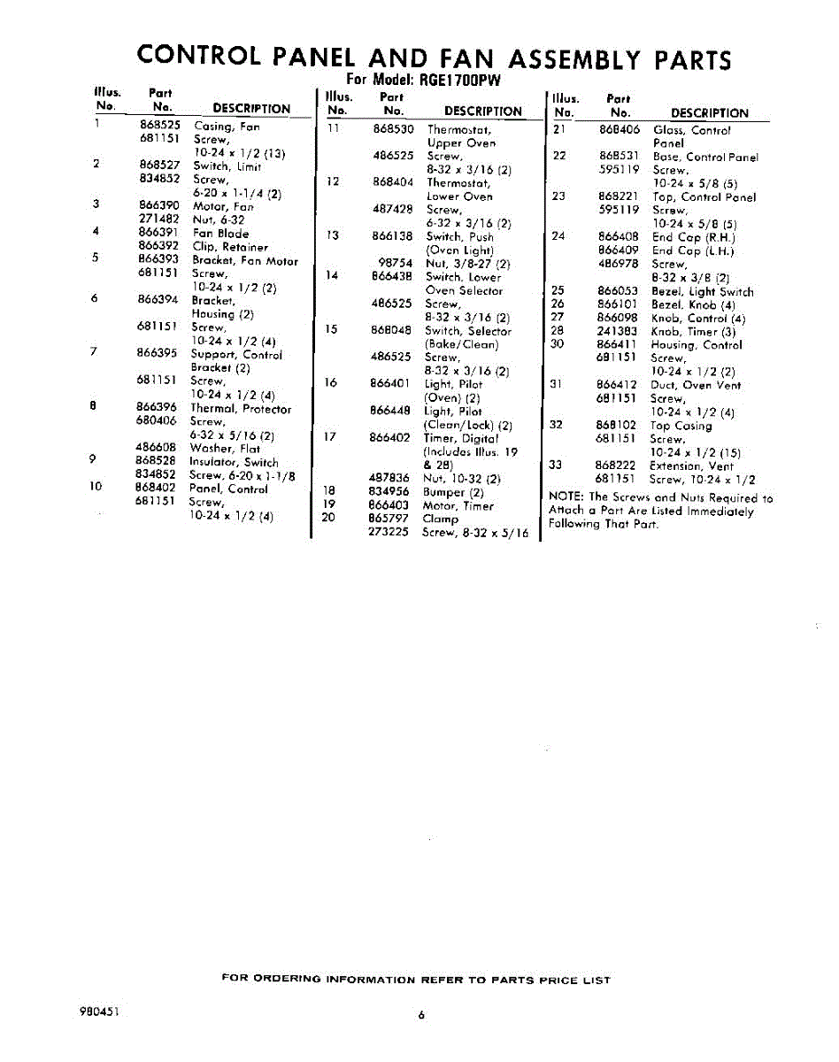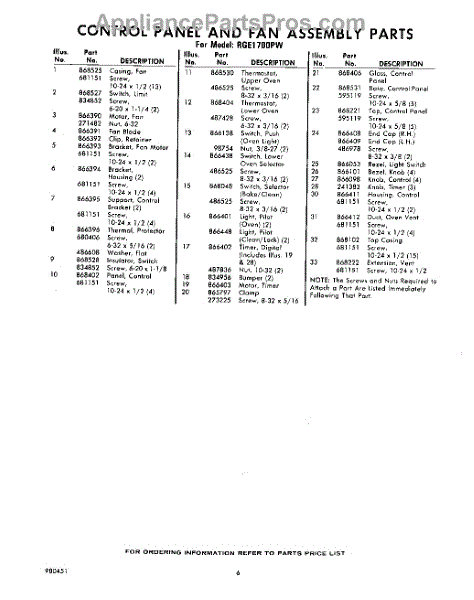 Parts for RGE1700PW