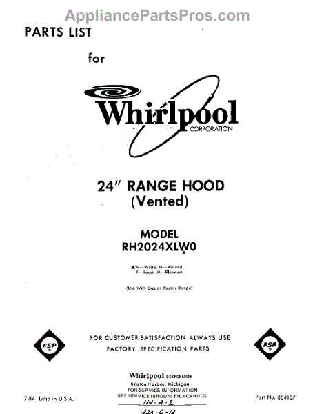 Parts for Whirlpool RH2024XLW0: 01 - Section Parts
